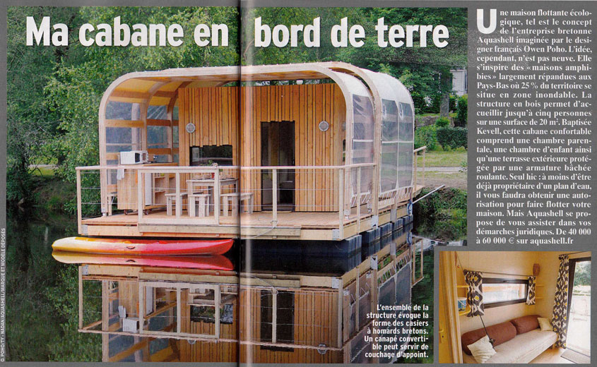 Au cœur de son édition de Mars 2013, le journaliste de Ca m’intéresse revient sur le concept de maison flottante imaginée par Owen Poho, le designer du projet. Influencé par les maisons similaires existantes au Pays –Bas, le design du Kevell rappelle les casiers de pêche à homards bretons utilisés autrefois.